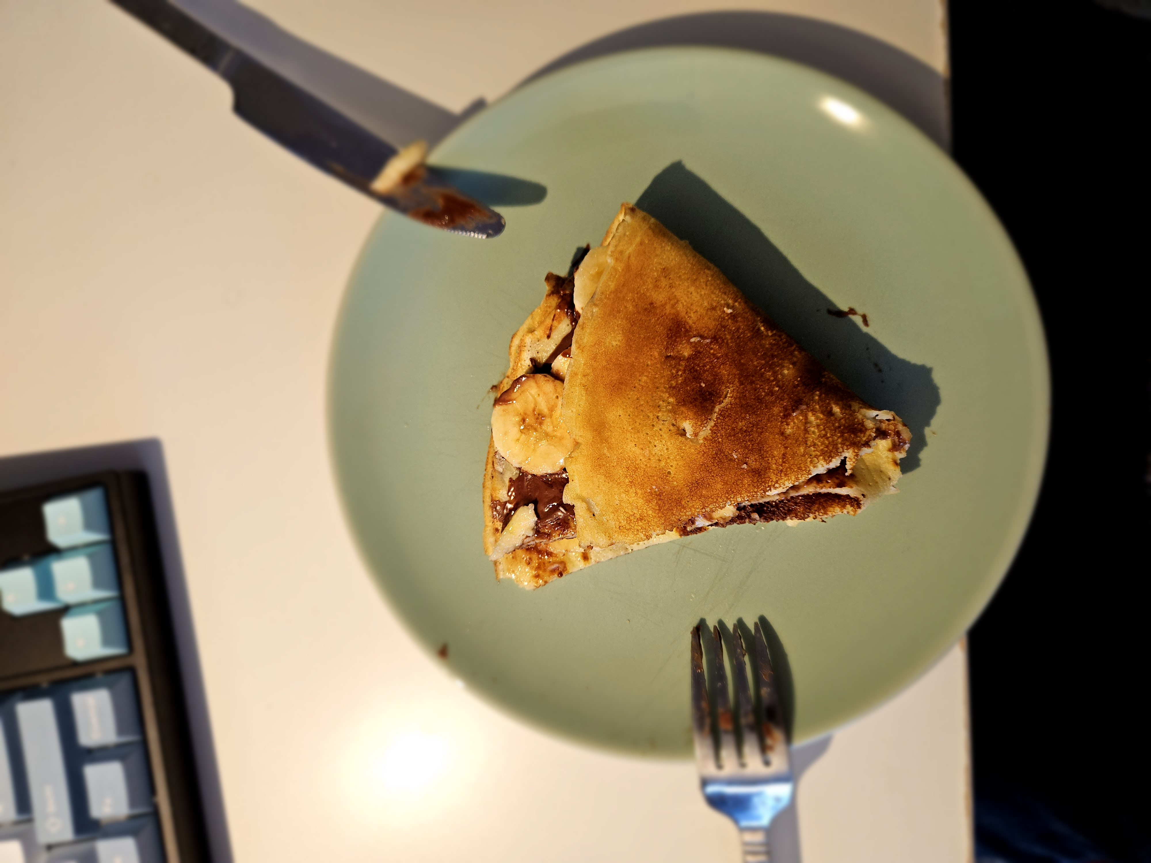 Pour in an amount of crepe batter the coat the bottom of your pan. When the bottom is cooked to a light brown, flip it over. Ideally you can just toss it using the pan, but you can also try using a fork to flip it, though caution that it might tear easily. Cook the other side until light brown and then remove from the pan. Then, add your favorite toppings, like nutella, bananas, berries, etc., fold it in half, and enjoy!