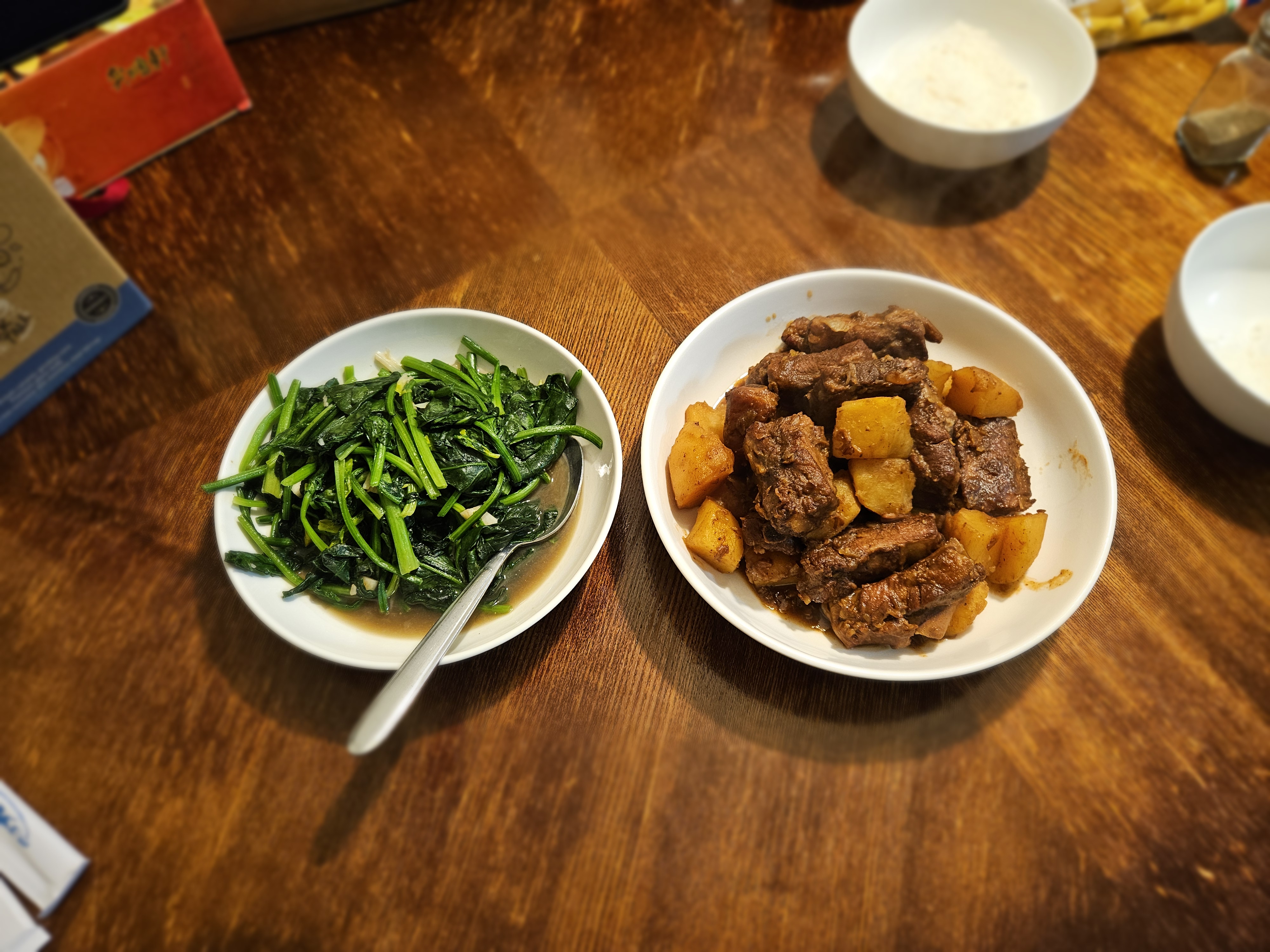 Heat your wok to medium heat. When hot enough (i.e., the wok is steaming, if you are using carbon steel) add a neutral oil and the ribs. Stir fry the ribs until a nice golden brown. DO NOT use high heat, otherwise the oil will smoke, your meat will burn, and your smoke alarm will go off. The purpose here is not to get a high temperature sear like with steak (the purpose of searing steak is to get a brown crust without overcooking the inside. For short ribs, since we are braising, we are not worried about overcooking and hence do not need such high heat), but rather to slowly fry it to get a golden brown. Initially, there might be excess water from the boiling step and the meat will not brown immediately. Resist the temptation to blast the meat with heat; once the water is evaporated, the pork ribs will start to brown.